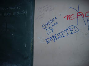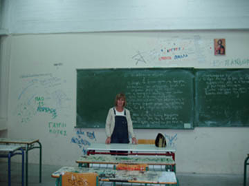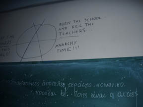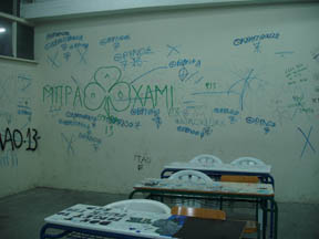 While visiting relatives about 4 or 5 subway stops outside of Athens, we took a walk and came upon a high school. It was late afternoon, school was not in session, the doors were open, so we went inside. We were shocked by what we saw. Every classroom, in varying degrees, was littered with graffiti, much of it in English, though students in Greece study French as their second language. The bathrooms were much worse. Later, we went back to the school with Pappou and a cousin, and he introduced us to the principal. We remarked on the graffiti. The friendly principal shrugged and replied, "Kids. The same all over, yes?"